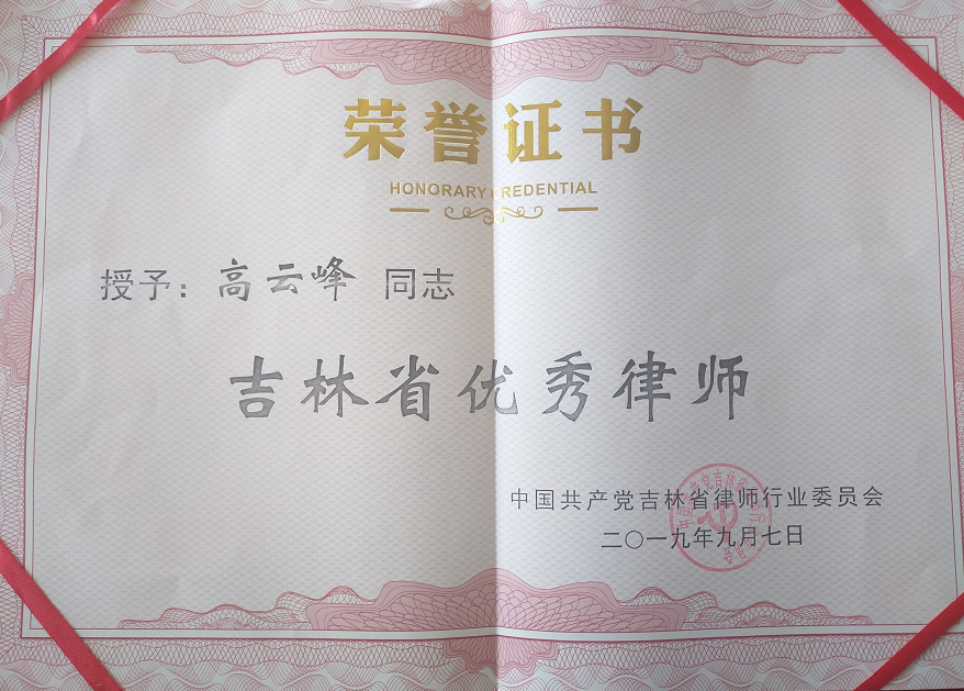 吉林吉大律师事务所高云峰主任被授予“吉林省优秀律师”荣誉称号。