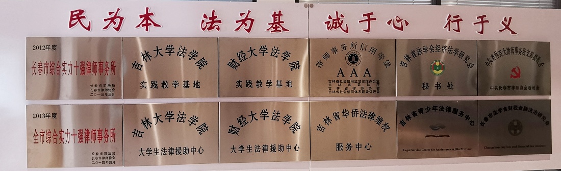 吉大律所视信誉如生命,认真践行“信誉立所、信用第一”的办所方针,赢得了社会各界的广泛称道。国家和社会给予了一系列殊荣:吉林省AAA级信用律师事务所、长春市综合实力十强律师事务所、吉林省法学会经济法学研究会秘书处、长春市创新型律师事务所、吉林大学法学院实践教学基地、吉林财经大学法学院实践教学基地等